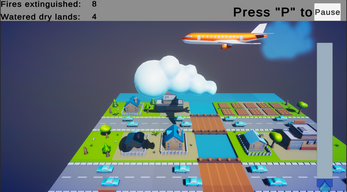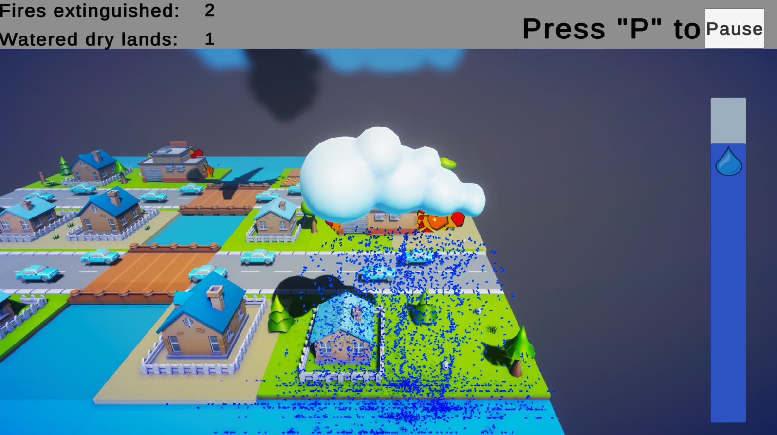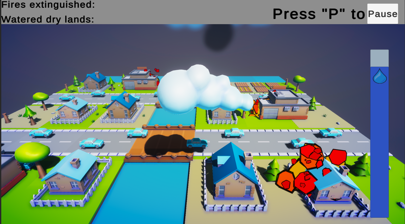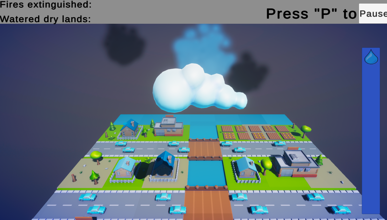 This is a looping game about you being a rainy cloud who needs to help the city over and over! The city constantly has disasters! Be in the part of the water cycle, pour water on disasters, collected evaporated water and repeat. Don't forget to avoid pollution, clouds don't like that.